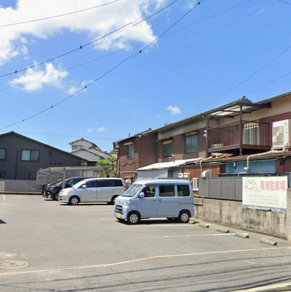 A 駐車場は店舗左横に3台(1台が軽専用)、店舗入り口から見て右側の共用駐車場にもう3台あります。